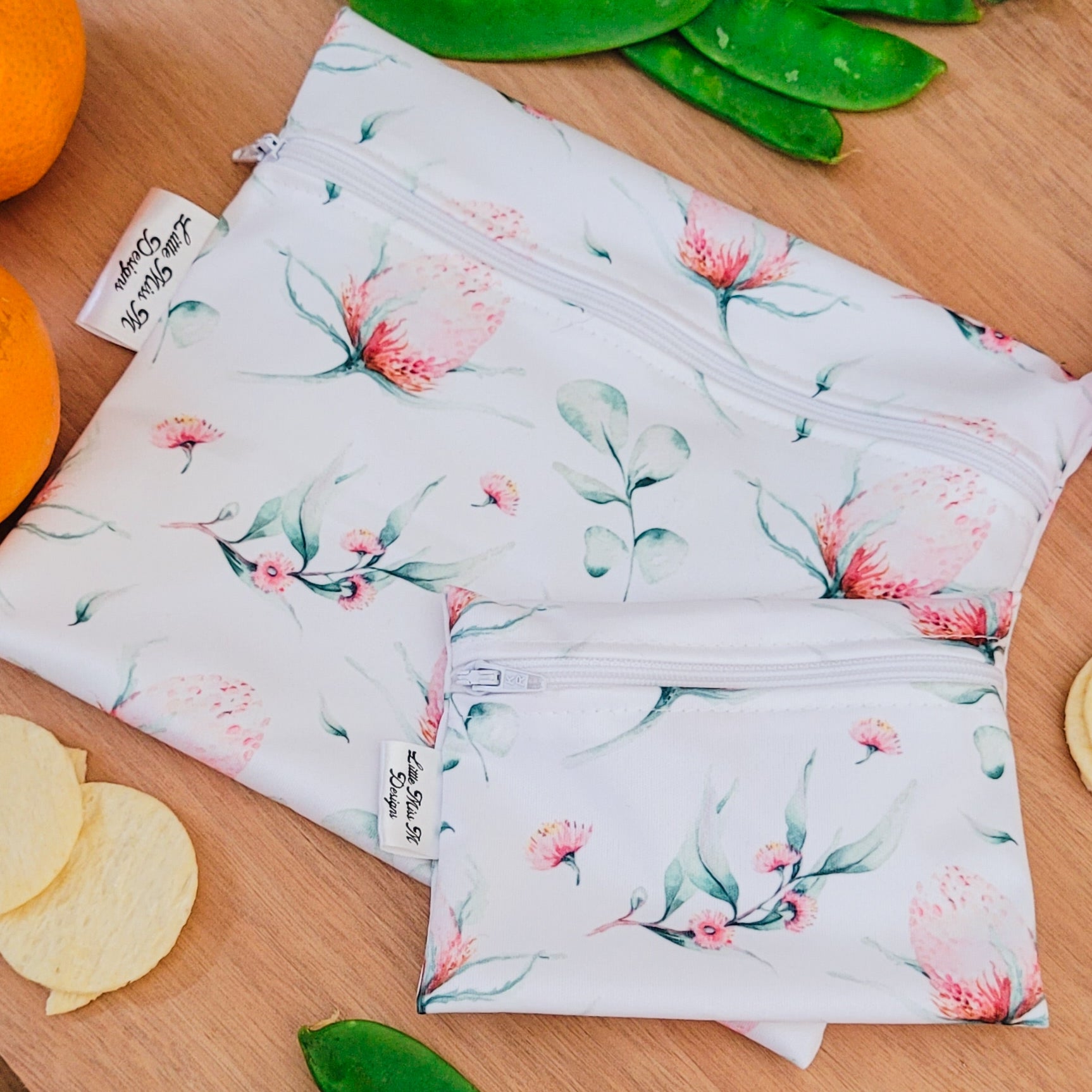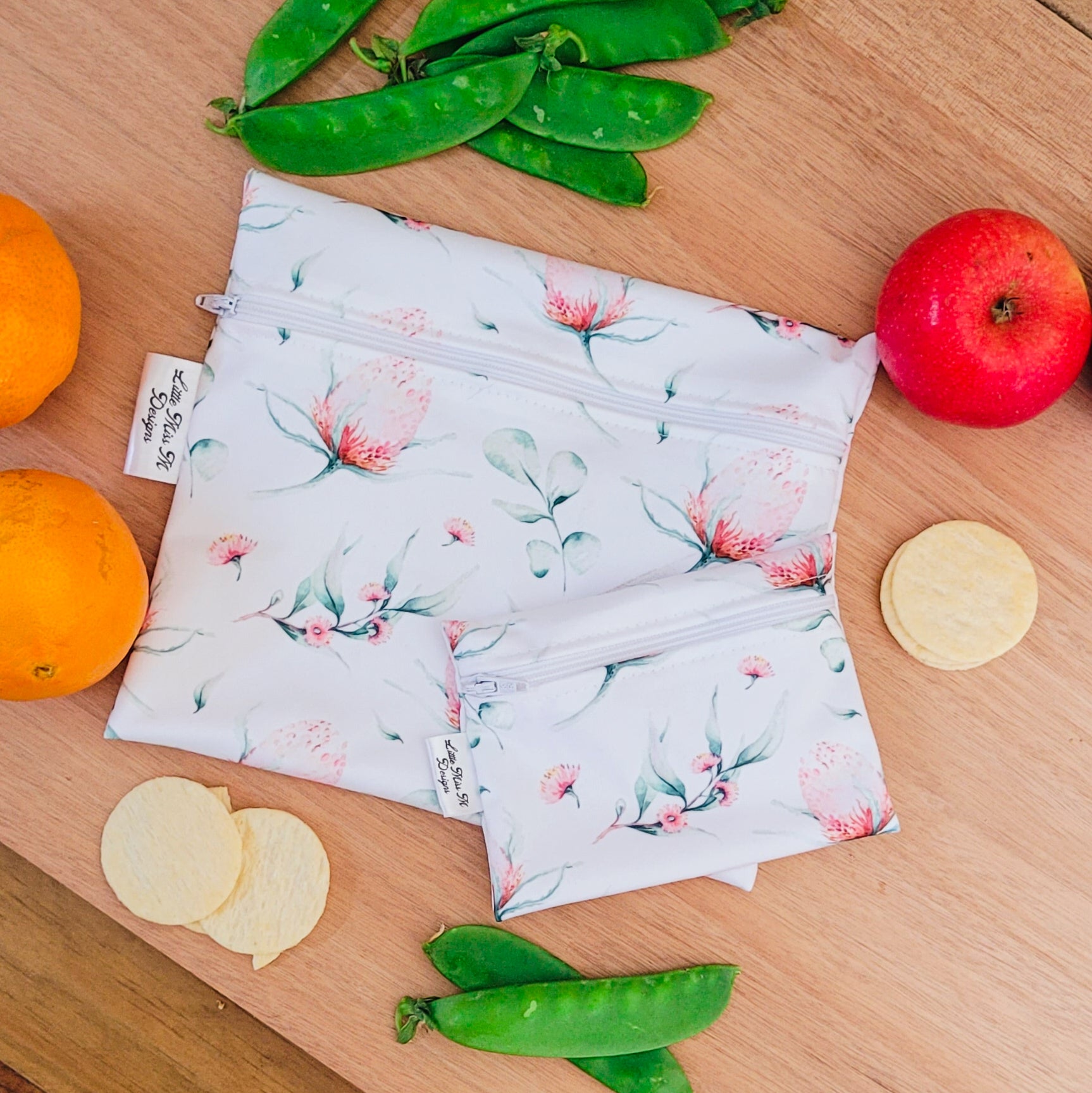 SNACK BAGS Keep your food fresh and your items organized with Little Miss M Designs Pty Ltd handmake Snack Bags. The material used is a PUL food safe material which has a waterproof layer on the inside so it is easy to clean and water resistant. To close and open the bag is a zip which means easy for little fingers to open and close and NO Velcro.