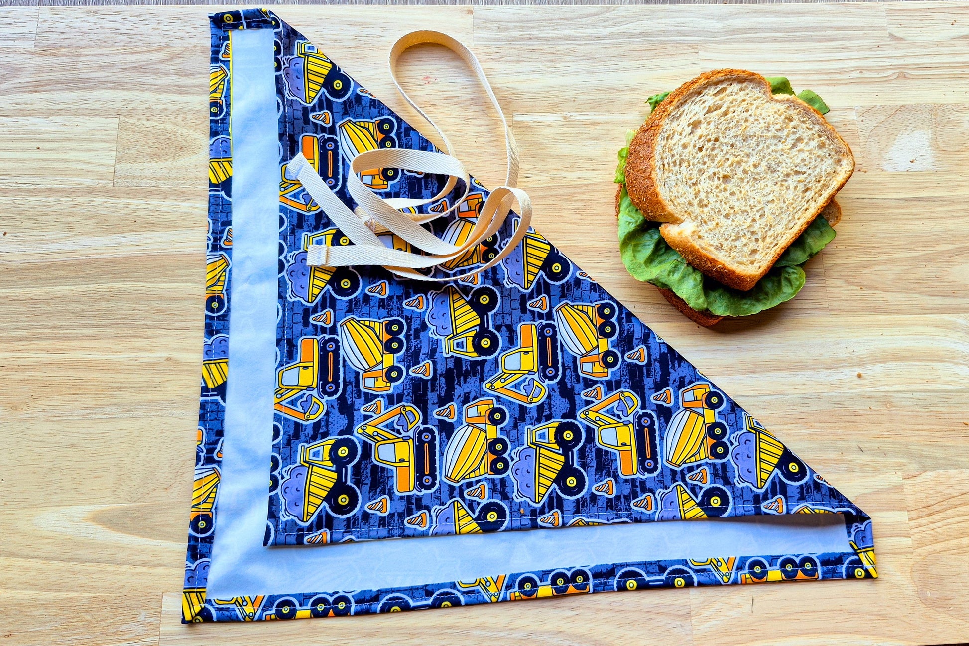 Our Food wraps are made from a high-quality laminated fabric and a 100% cotton ribbon which can be washed by placing in the washing machine. Once the food is wrapped you can secure it by tying a bow, this allows little fingers to open easily.