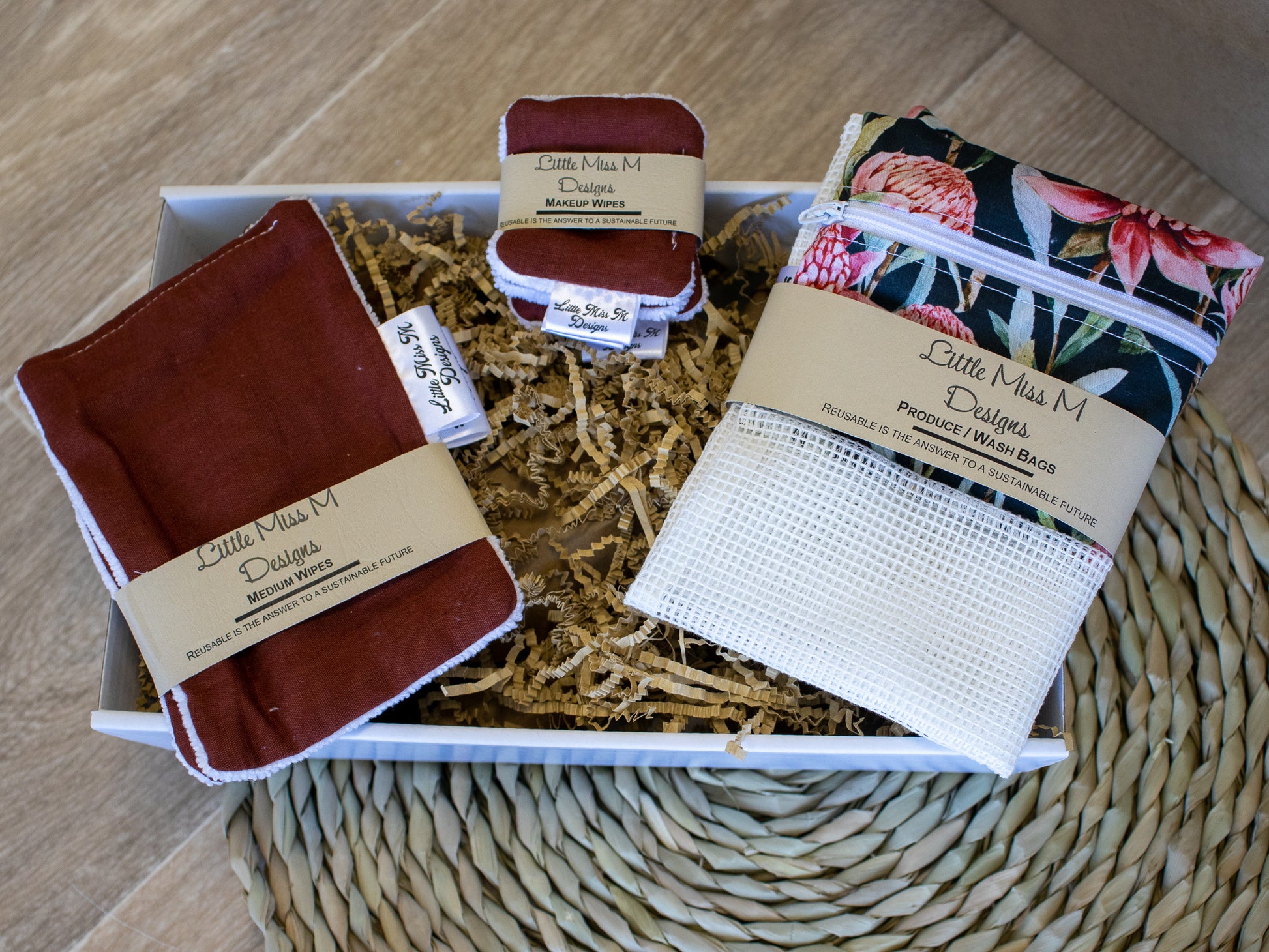 Hamper - 3 Large Wipes, Snack Bag pack (2 small, 1 Medium & 1 Larger), 3 Small Makeup Wipes, 2 medium Makeup Wipes, 1 Mesh & 1 Muslin Produce bags displayed and packaged in a cardboard box