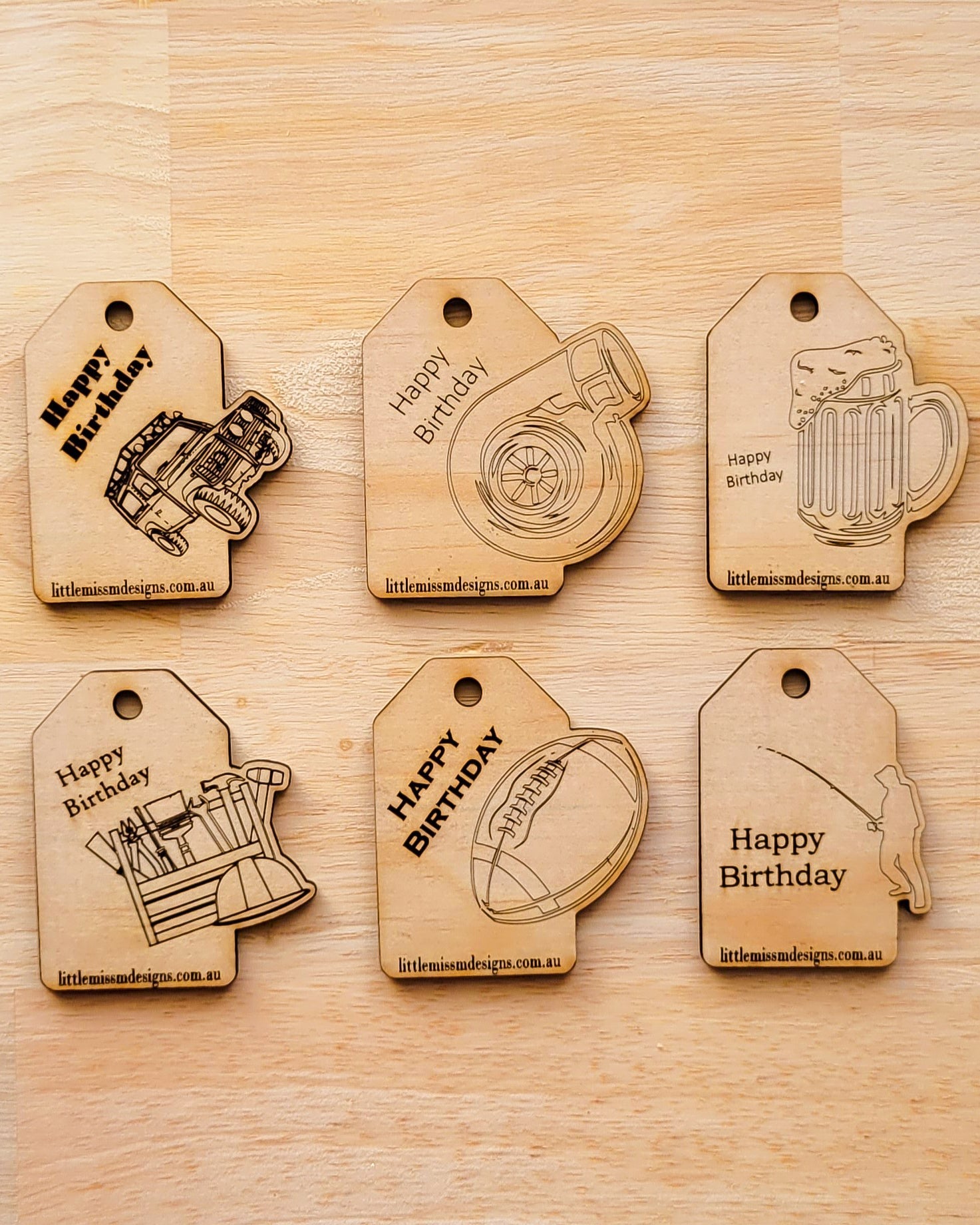 The Tags are made from Timber and contain a Black Board area to write the recipients name. This means after giving the recipient can wipe off their name off with a wet cloth and write in chalk the next lucky person they wish to give to. To make it even more special a picture is etched or laser cut for the special occasion.