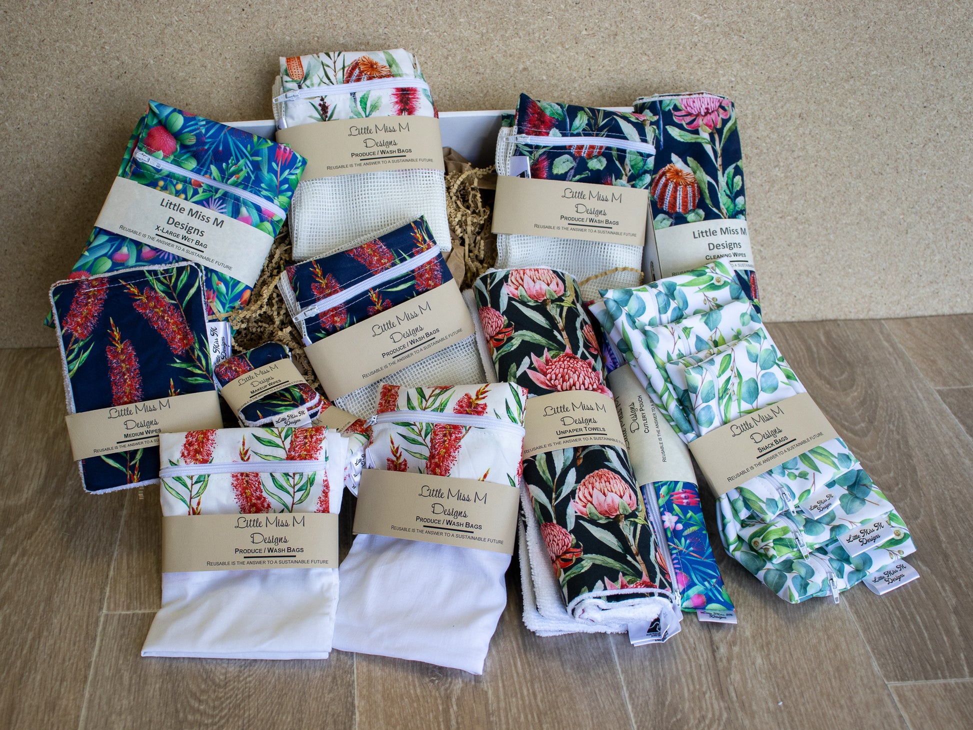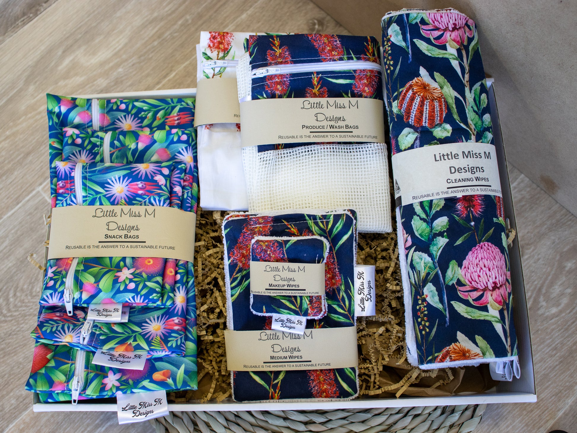 Hamper - 3 Large Wipes, Snack Bag pack (2 small, 1 Medium & 1 Larger), 3 Small Makeup Wipes, 2 medium Makeup Wipes, 1 Mesh & 1 Muslin Produce bags displayed and packaged in a cardboard box