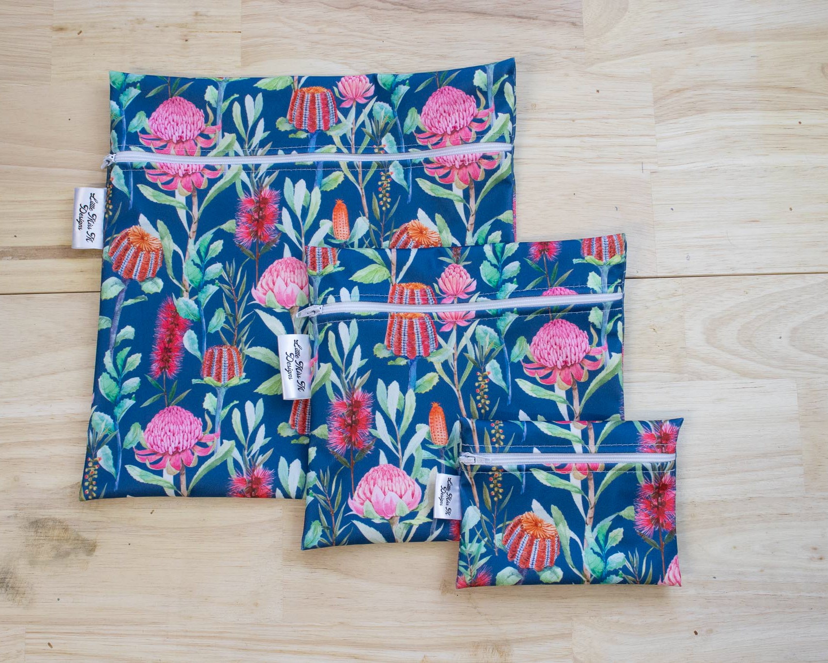 SNACK BAGS Keep your food fresh and your items organized with Little Miss M Designs Pty Ltd handmake Snack Bags. The material used is a PUL food safe material which has a waterproof layer on the inside so it is easy to clean and water resistant. To close and open the bag is a zip which means easy for little fingers to open and close and NO Velcro.