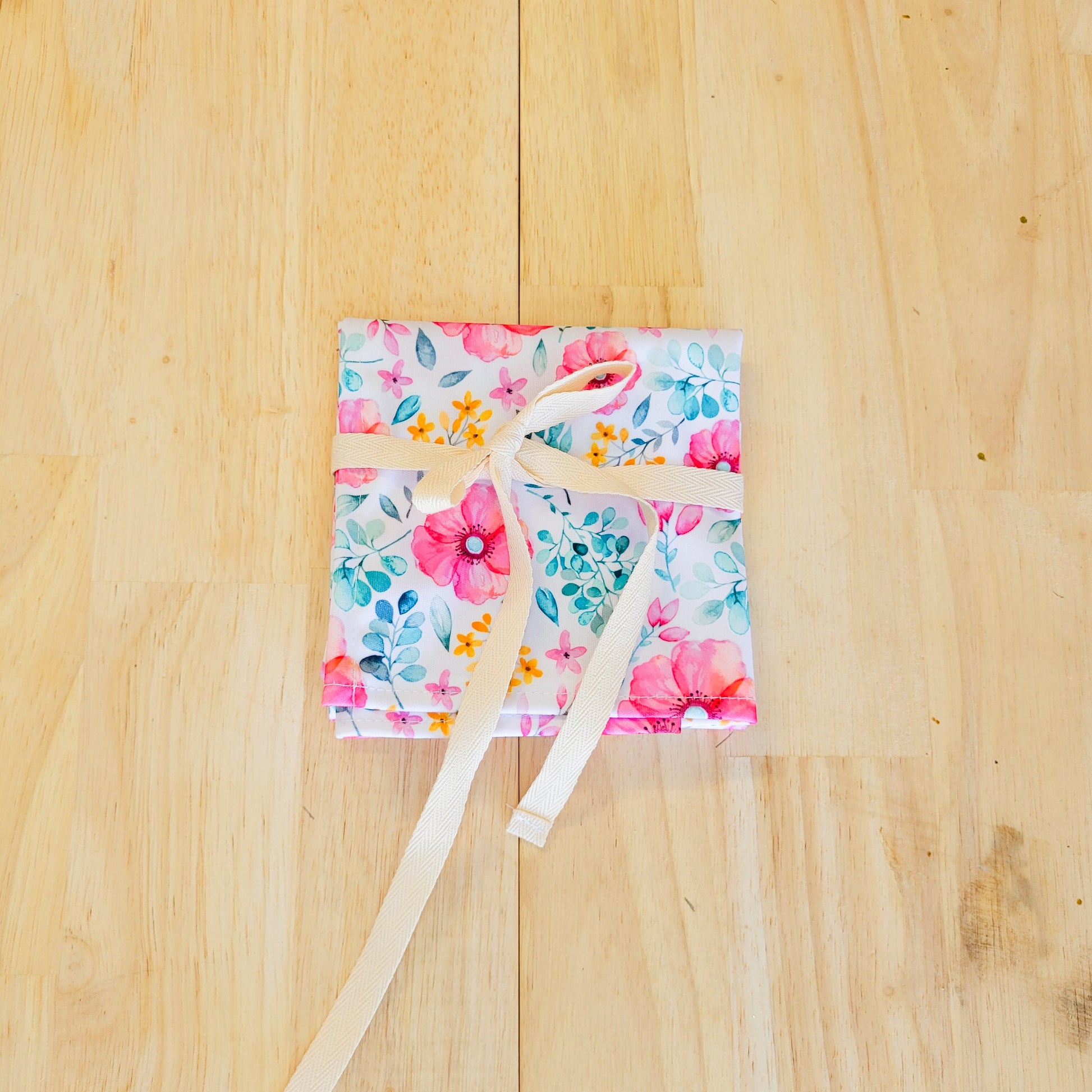 Our Food wraps are made from a high-quality laminated fabric and a 100% cotton ribbon which can be washed by placing in the washing machine. Once the food is wrapped you can secure it by tying a bow, this allows little fingers to open easily.