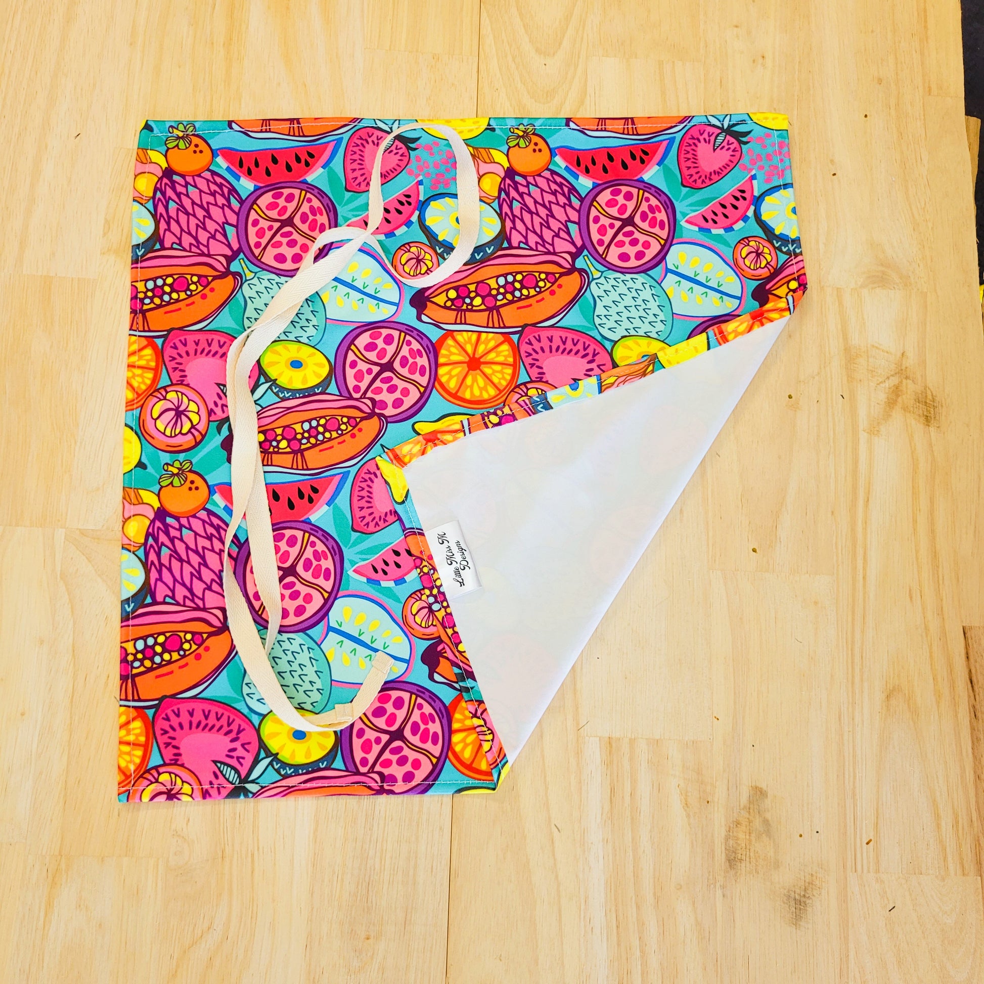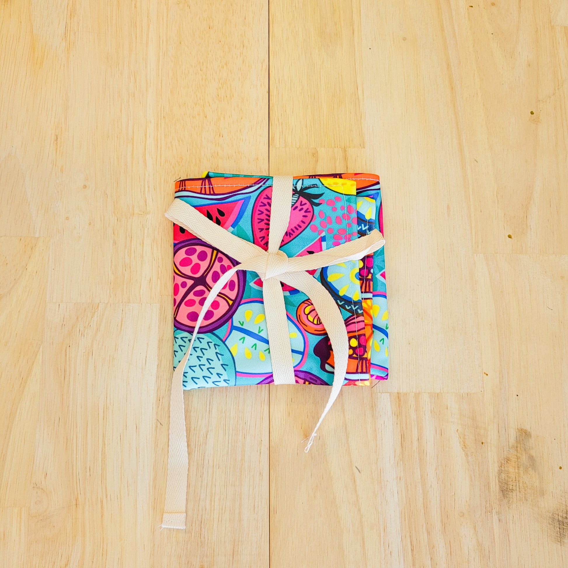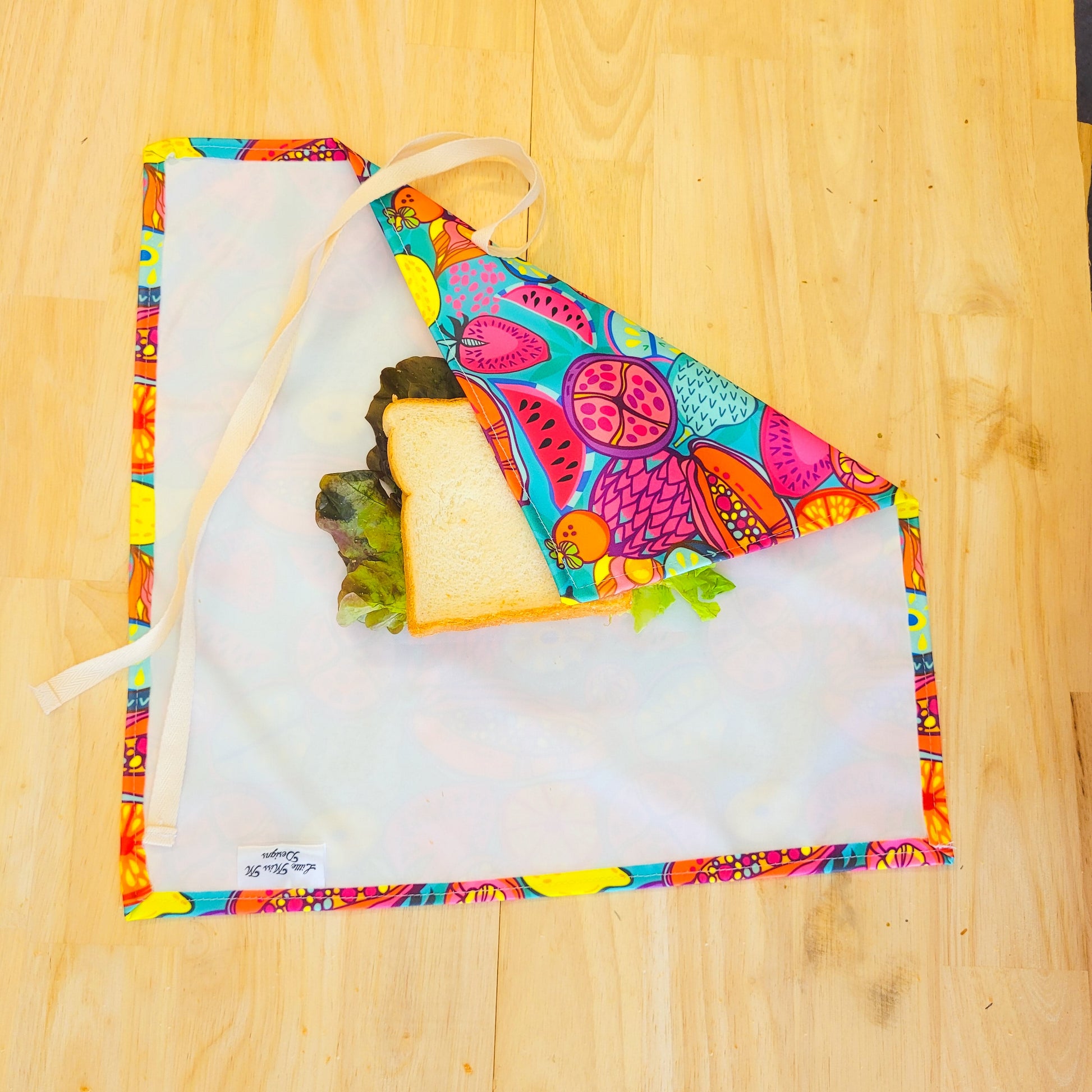 Our Food wraps are made from a high-quality laminated fabric and a 100% cotton ribbon which can be washed by placing in the washing machine. Once the food is wrapped you can secure it by tying a bow, this allows little fingers to open easily.