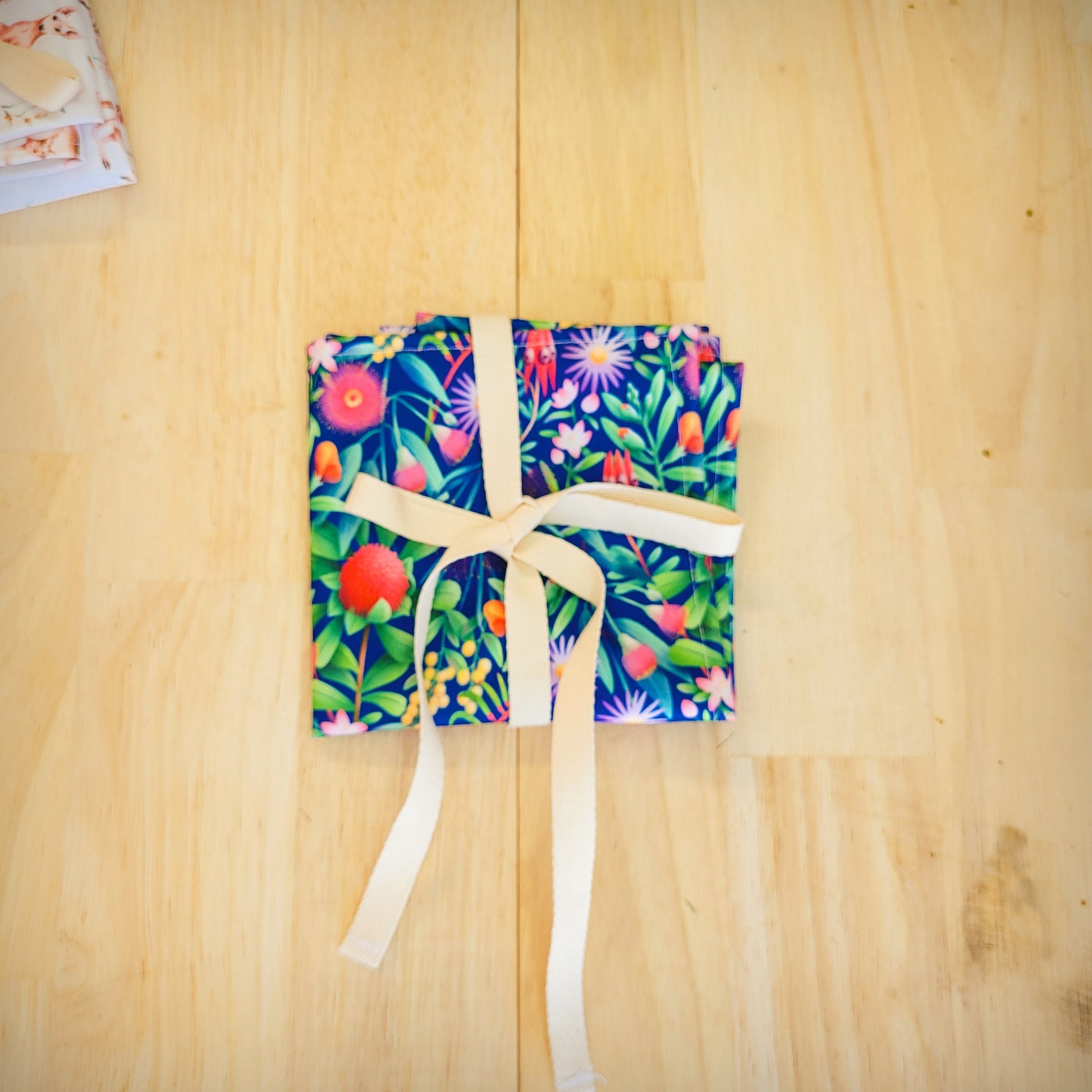 Our Food wraps are made from a high-quality laminated fabric and a 100% cotton ribbon which can be washed by placing in the washing machine. Once the food is wrapped you can secure it by tying a bow, this allows little fingers to open easily.